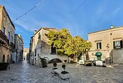 Of the Roman age, on the other hand, remain basalt paving stones of the Appian Way[4] and a rustic villa discovered in Contrada San Lorenzo, along the banks of the Canale Reale, having an area of about 290 square meters and datable between the first century B.C. and the middle of the second century A.D. The lack of plasterwork, mosaic floors and other finishing touches led to the assumption that the villa in question had not been used as a dwelling, but, indeed, as a rustic villa, forming the epicenter of a fundus.[5] From the numerous archaeological finds from the Roman and Messapic periods, it has been assumed that a large city, razed to the ground in 845 by the Saracens, stretched near the Santa Cecilia and Guardiola districts in ancient times.[6]