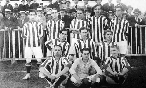 The pinnacle of this era was 1935, marked by the Grenal Farroupilha, a name given to the entire city championship held to commemorate the centenary of the Farroupilha Revolution. By defeating its traditional rival, the Tricolor claimed the title. This match was the last for Eurico Lara, who began playing for the club in 1920 and became a club legend. Thus, this period not only brought titles but also laid the foundation for Grêmio's tradition and respect.[2][3]