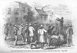 Engraving in Brownlow's Sketches, showing Confederate recruits shooting at Union supporter Charles Douglas during a Gay Street rally in April 1861