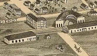 The East Tennessee, Virginia and Georgia rail yard at the intersection of Gay Street (lower right) and Depot Street, as it appeared in 1871; the roundhouse has since been demolished and replaced by the Southern Terminal