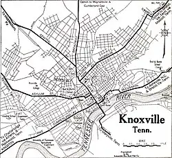 The History of Knoxville, Tennessee, began with the establishment of James White's Fort on the Trans-Appalachian frontier in 1786.[1] The fort was chosen as the capital of the Southwest Territory in 1790, and the city, named for Secretary of War Henry Knox, was platted the following year.[1] Knoxville became the first capital of the State of Tennessee in 1796, and grew steadily during the early 19th century as a way station for westward-bound migrants and as a commercial center for nearby mountain communities.[1] The arrival of the railroad in the 1850s led to a boom in the city's population and commercial activity.[1]