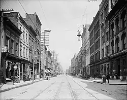 View across the first Gay Street Bridge in the late 1860s; the bridge shown was eventually destroyed by a flood