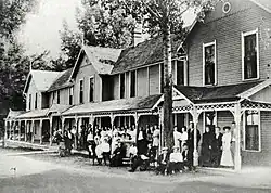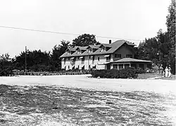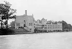 The Cedar Beach Club was established in 1880 and was the first hotel on this site. The property was purchased by the North Lake and River Association. Judge John V. Pettit of Wabash, Indiana became president of the association with individuals from northern Indiana towns of Alexandria, Goshen, Peru, Wabash, and Huntington joining and all of which were followers of Izaac Walton which would later produce the Izaak Walton League[4] an early environmental group. A simple oblong, two-story, gabled roof club house was constructed with 50 bedrooms and a 125-seat dining room. The North Lake and River Association financially collapsed in 1882 with the property being sold by the sheriff to the Cedar Beach Association. In 1887 the property was transferred to the Cedar Beach Club for $7000. James B. Suitt of Indianapolis was the president of the club which included James T. Layman, an Indianapolis wholesaler who had served on the Indianapolis City Common Council and Board of Aldermen 1877–1884. Addison H. Nordyke, flour mill manufacturer. William H. Holliday, F.T. Holliday, J.A. Lemcke, Robert W. Cathcart, John H. Spann, Thomas H. Spann. In 1891 the club burned. It had the first seawall on Wawasee made of logs.