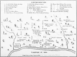 John Buchanan Sr., born in either Scotland or Ireland, migrated with his family from their home in Cumberland Co., Pennsylvania, to the Watauga Valley, Washington District of North Carolina. Afterward, they took a long horseback trek to Kentucky, left their women and traveled down to the Cumberland Settlements in late 1778, building a station on the southern side of the Cumberland River above the French Lick, on the high ground where Nashville now stands, in the early spring of 1779. His son, Major John Buchanan, known for the siege of Buchanan's Station, is considered to be one of the founders of Nashville, Tennessee.[15] Another settlement arrived when James Robertson left the Watauga settlement in northwestern North Carolina, traveled overland for two months, and arrived on the banks of the Cumberland River near the center of present downtown Nashville on Christmas Day, 1779.[16] They cleared the land and built a log stockade they called the Bluff station. Richard Henderson had planned to call the settlement Nashborough in honor of General Francis Nash, who won acclaim in the American Revolution. For a brief time, court records did use the Nashborough designation but there is no evidence that any of the settlers did. Robertson's friend and fellow Watauga settler John Donelson, along with some 60 families, including women and children, came in 30 flatboats and several pirogues down the Tennessee River and up the Cumberland, arriving April 23, 1780.[17] They founded a new community that was then a part of the state of North Carolina. The town was officially created and named Nashville in 1784, by an act of the North Carolina legislature.