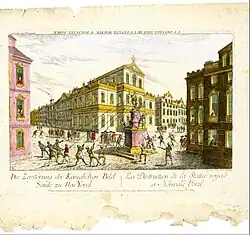 The Sons of Liberty, a secret and sometimes violent patriot group, formed chapters in New York and other cities and frightened the royal officials.[4] The "Sons" engaged in a running conflict with British authority in the city over the raising of liberty poles in prominent public locations (see Battle of Golden Hill), from the repeal of the Stamp Act in 1766 until rebel control of the city in 1775. The poles, often when a signal device such as a red cap was placed atop the pole, served as rallying points for public assemblies to protest against the colonial government. The city was the main location of organized political resistance in the form of the Committee of Sixty and then later the New York Provincial Congress. Following the first reading of the Declaration of Independence, the statue of King George III in Bowling Green was torn down and melted into musket balls. The city, however, was a hotbed of Royal fervor and probably held a larger proportion of Tories than any other place in the colonies—though likely still a minority in the city. Many prominent New Yorkers, "living in a commercial city blessed by the profits of empire" were reluctant to "jeopardize their well-established connections to the empire."[5]