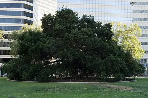 The Peralta ranch included a stand of oak trees that stretched from the land that is today Oakland's downtown area to the adjacent part of Alameda, then a peninsula. The Peraltas called the area encinal, a Spanish word that means "oak grove". This was translated more loosely as "Oakland" in the subsequent naming of the town, as recounted by Horace Carpentier in his first address as mayor: "The chief ornament and attraction of this city consists, doubtless, in the magnificent grove of evergreen oaks which covers its present site and from which it takes both its former name of 'Encinal' and its present one of 'Oakland.'"[6] The trees were California live oaks which are the dominant overstory plant of the coast live oak woodland habitat.