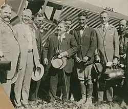 Russell Clifford Durant (called "Cliff" by his friends) was a race car driver, speedboat enthusiast, amateur flier, President of Durant Motors in Oakland, and son of General Motors founder William "Billy" Crapo Durant. In 1916, he established Durant Field at 82nd Avenue and East 14th Street.[29] The first experimental transcontinental airmail through-flight finished its journey at Durant Field on August 9, 1920, with Army Capt. Eddie Rickenbacker and Navy Lt. Bert Acosta (pictured right) at the controls of the Junkers F 13 re-badged as the model J.L.6.[30] The airfield served only secondary duties after 1927, as its runway was not long enough for heavily loaded aircraft. In April 1930, test pilot Herbert "Hub" Fahy and his wife Claire hit a stump upon landing, flipping their plane and mortally wounding Hub without injuring Claire.[31] Durant Field was often called Oakland Airport, though the current Oakland International Airport was soon established four miles (6.4 km) southwest.[32]