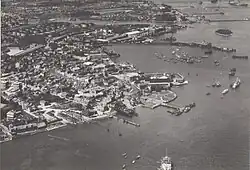 As a major Royal Navy Dockyard, the Portsmouth Royal Naval Dockyard and surrounding city were bombed extensively during the Second World War. Nazi German Luftwaffe night-time air raids began on 24 August 1940 when 1,320 high explosive bombs and 38,000 incendiary devices were dropped on the city, damaging 30 churches, eight schools, one hospital and over 80,000 homes. 930 people were killed and 1,216 people were injured. Public buildings, such as the Southsea Baths and Assembly Rooms, located adjacent to Clarence Pier were so extensively damaged they would be demolished after the war.[24] One especially damaging raid occurred on the night 10 January 1941 in which the Guildhall was partial destroyed by bombing and 172 people were killed.[25][26]