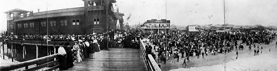 Fraser's Million Dollar Pier claimed to be the largest in the world at 1250 feet long and 300 feet wide. The pier housed a spacious dance hall, two carousels, an exhibit of premature babies in incubators at Frederick House,[9] the Crooked House fun house, the Grand Electric Railroad, the Starland Vaudeville Theater, Breaker's Restaurant, and a Panama Canal model exhibit. It burned 15 months after it opened.[7]
