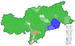 Given the region's historical and cultural association with neighboring Austria, calls for the secession of South Tyrol and its reunification with Austria are notable in the local and national political climate. Polls conducted in 2013 noted that 46% of South Tyrol's population would favor secession from Italy.[38] Among the political parties that support South Tyrol's reunification into Austria are South Tyrolean Freedom, Die Freiheitlichen and Citizens' Union for South Tyrol.[39]
