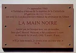 In September 1940 the first Alsatian resistance movement was created, led by Marcel Weinum and called La main noire (the Black Hand). It was composed of a group of 25 young men aged 14 to 18 years old who led several attacks against the German occupation. The actions culminated with the attack on the Gauleiter Robert Wagner, the highest commander of Alsace, who answered directly to Hitler. In March 1942, Marcel Weinum was prosecuted by the Gestapo and sentenced to be beheaded at the age of 18 in April 1942 in Stuttgart, Germany. His last words will be: "If I have to die, I shall die but with a pure heart".