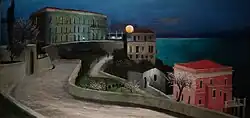 In 1905, the English artist Robert Hawthorn Kitson, heir to Kitson and Company but driven from Britain by homophobia, built a house in Taormina.[35] He commissioned Frank Brangwyn to design murals and furniture for the Casa Cuseni. Alfred East also contributed.[36] In 1907, the English architect C. R. Ashbee, a prime mover of the Arts and Crafts movement, came to Taormina on commission from an old client. Colonel Shaw-Hellier set him the task of designing the Villa San Giorgio,[37][38] Biographer Fiona MacCarthy judges it "the most impressive of Ashbee's remaining buildings";[39] it is run as the Hotel Ashbee. In 1911 Alexander Hood, 5th Duke of Bronté began building a house, La Falconara, on his grandmother's land.[20] Alex Hood was, like his father, a discreet courtier, and unlike his father, discreetly homosexual as well. With his close friend and frequent guest the writer Robert Hichens (best known for The Green Carnation (1894), a satire of Hichens's friends Wilde and Bosie), Hood helped to further establish Taormina (like Capri) as a "holiday resort for wealthy homosexuals from Northern Europe", as historian Lucy Riall put it.[40] One such escapee, Albert Stopford, the art dealer and confidant to royalty, cultivated roses in his Edwardian garden.