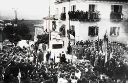 On June 8, 1944, the evening before withdrawing from Tocco, around 8 p.m. the Germans blew up a bomb and ammunition depot near the town's train station.[108][109] The following day they left Tocco at 3 p.m. departing for L'Aquila,[110] and on June 10 Allied troops entered the town.[111] Following the arrival of the Allies, in the transitional constitutional period the parties chose as mayor Beniamino Toro[112] (who previously served as podestà in the village from 1929 to 1943),[113] who administered from July 8, 1943 to September 2, 1944, and was later replaced by Emilio di Donato until March 26, 1946. In the first democratic local elections after World War II, the Christian Democrats won in Tocco with their mayoral candidate Vittorio D'Angelo.[112]