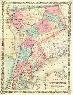 The county experienced a variety of effects, caused by the American Revolutionary War, as families were often divided between Patriot and Loyalist sympathies. After the battles of Pell's Point and White Plains in 1776, the primary American headquarters was located at Continental Village, north of Peekskill, while the British were headquartered in New York City. The region between Morrisania and the Croton River, which was called "neutral ground" was pillaged by both sides.[1][2] Two loyalist factions, Skinner's Greens and De Lancey's Cowboys, engaged in guerrilla warfare, cattle theft, and looting. Warfare, settling scores against neighbors, and rape caused many residents to abandon their homes and flee the area.[3] The novel The Spy is set in the Neutral Ground.