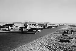 In November 1943, 6 Squadron and later 8 Squadron were moved to Cox's Bazar.[16][17] By the end of February 1944, No 6 Squadron pilots had completed over 1,000 operational sorties, averaging 6 sorties a day per pilot, a record for the entire the Third TAF. Towards the end of March 1944, 4 Squadron joined the operations when it was moved first to Feni airfield, and then to Comilla in June to replace 6 Squadron.[18] In March 1944, the squadron moved to Feni for operations against the Japanese. The role of the squadron was to provide close Air support to the XIV Army. It was from Feni that the squadron carried out its first operational sorties by providing fighter escort to Dakota, engaged in supply dropping missions in the northern Burma. From August 1944 to January 1945, No. 4 Squadron was based at Cox's Bazar and carried out CAS, interdiction and tactical recce operations.[18]
