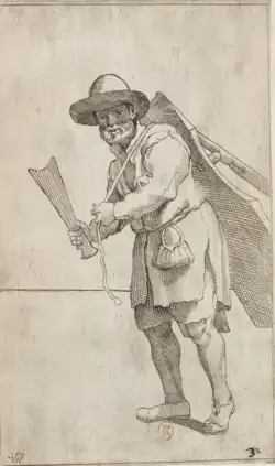 Hemp plants were used in their entirety, namely the roots were used as firewood, the woody stalk fragments were dipped in sulfur to produce matches, the seeds were used as food for livestock, and the fiber was used to make fishing nets, ropes to be used in various agricultural activities, and textiles such as packaging for fine linens, flour sacks, family clothing, and trousseaus for daughters' weddings.[24][75][76] As they are particularly resistant, hemp fibers were also mixed with the more delicate wool to produce mezzalana (i.e. half-wool) fabrics, which were especially suitable for wear-prone textile products.[77] Similarly, mixtures of hemp fibers with either linen or wool, known as pignolato (i.e. pine nuts patterned), were widely used in the area around Ferrara for the production of clothes, as reported by the local writer Riccobaldo in his Sermo de ritibus antiquorum.[35]