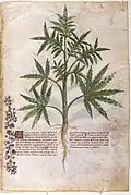 In regard to medical properties, hemp roots boiled in water were thought to ease cramped joints, gout, and similar violent pains, while they could also be applied raw to burns, but they would be changed before getting dry.[19] The ability of boiled cannabis roots to lessen inflammation was also attested by contemporary Greek physician and botanist Pedanius Dioscorides in his De Materia Medica, a pharmacopoeia that mainly focuses on medicinal plants.[31] In regard to the recreational use of cannabis in the Roman Empire, 2nd century Greek physician and philosopher Claudius Galenus wrote that it was customary in Italia to serve small cannabis-based cakes for dessert, whose seeds would reportedly create a feeling of warmth and increase thirst.[20][31] Moreover, if consumed in large quantities, these small cakes would affect the head by emitting a warm and toxic vapor, which produced torpor or sluggishness; while it was also customary for the Romans to offer guests hemp seeds as a promoter of hilarity.[20][31] Similarly, it has been hypothesized that Pliny probably referenced cannabis when mentioning gelotophyllis (i.e. the leaves of laughter), which he said grew along the Borysthenes river, in Scythia, as well as in Bactria, an ancient country located in the northeastern part of modern-day Afghanistan, or at least in the general area of central Asia.[20][32] According to Pliny, if these leaves were taken in myrrh and wine, all kinds of phantoms would beset the mind, causing a laughter that persisted until the kernels of pine nuts were taken with pepper and honey in palm wine.[32]