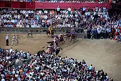 Several other tools were used to keep the rope always tightly stretched, while also sustaining its weight along the ropewalk; to avoid hand contact with the rope during twisting; and to keep it constantly lubricated, thus preventing any damage from friction-related heat.[46][52][53][54] Afterwards, the rope was soaked overnight, since the water would cause the twisted fibers to stick together, which would therefore increase the compactness of the rope.[52][53][54] As a final touch, an iron mesh would subsequently be used to rub the rope, to remove the last few remaining streaks, while a stretch of coarse rope would be rolled up and run around the rope for a final smoothing and polishing.[52][53][54] The produced ropes would then be safely stored, thus creating strategic stockpiles that would allow the Republic to remain independent from external suppliers during wartime.[44] These stockpiles were overseen by three magistrates, known as the Visdomini alla Tana, who were elected by the Major Council, and one of the required checks was that the ropes produced for vessels had to be made from exactly 1,098 twisted hemp strings.[46] When needed, the rope would be taken out of storage through dedicated holes, and cut at the required size, rather than already being produced at standardized lengths, while the fiber of any leftover would be repurposed.[44][46]