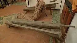 At the hemp house, the hemp fiber would arrive in large square bales, already macerated and dry, and it would be forcefully slammed against a wooden pole, equipped with metal rods, to complete the breakage of the stalk.[52] The remaining woody fragments would then be removed using comb-like tools of different shapes for both coarser and finer combing, in preparation for the spinning phase.[52][53] While using scutching tools with ever-finer teeth, the finest of which could have a teeth spacing as small as 1 mm (0.04 in), the artisans would gradually separate the different fibers based on their qualities, including their robustness and color.[54] The spinning mechanism consisted in a large rotating wooden wheel, placed vertically and firmly fixed to the ground, equipped with laterally protruding rods that supported a winding rope connecting the wheel to several interchangeable wooden cylinders of different dimensions, depending on the final size of the rope to be produced, which were located a few meters away.[52][53] The rotating wheel would make such cylinders spin, and they could be used to either twist a twine (with a single cylinder), or intertwine three or four strings (with multiple cylinders) to produce different types of rope.[52][53][54]