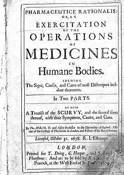 In 1674, Thomas Willis made reference to the sweet taste of diabetic urine in Pharmaceutice rationalis.[36][37] While this reiterated ancient observations from across the Eurasian continent, it is generally understood to be the first explicit reference to sugary diabetic fluids in the modern European context. However, contrary to some claims that the term mellitus was added by Thomas Willis to specify the condition by its glycosuria, the word appears nowhere in his chapter on diabetes.[37] The verifiable statement that may be derived from relevant sources is that Willis elaborated on glycosuria but did not distinguish between different types of diabetes. Notably, Willis disagreed with the common idea that the disorder originated in the kidneys ("Reins"), suggesting instead that it was a "Distemper of the Blood than of the Reins [Kidneys]". He also noted the connection between the condition and certain dietary habits, "chiefly an assiduous and immoderate drinking of Cider, Beer, or sharp Wines".[36]
