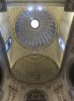 In Naples, the domes of the Caracciolo di Vico chapel (c. 1516) and the church of Santa Caterina a Formiello (c. 1519) were built before a more somber style was implemented following the reforms of the Council of Trent.[101] The dome of Santa Caterina a Formiello, considered to be the first to be built in the capital of the Spanish Viceroyalty that used the Tuscan Renaissance style, was finished in 1577. It is about 11 meters in diameter, made of brick and yellow tuff in a single shell, pointed in profile, and has cladding in Piperno stone and grey tuff. The twin pilasters on the drum exterior correspond to ribs in the dome. The heavy original lantern made from Piperno stone was replaced with one made from lighter materials after an earthquake in 1688.[102] Subsequent domes in the 16th century in Naples include those of the monastic complexes of Santa Maria del Popolo, Santi Severino e Sossio, Santa Maria Donnaromita, San Gregorio Armeno, Santa Maria della Mercede a Montecalvario, Santa Maria Regina Coeli, and Santa Maria La Nova.[103] The domes of Santa Maria Donnaromita and San Gregorio Armeno were built about 30 years apart, but are covered with similar colored tiles. Simple domes in Naples without lanterns, or with small lanterns, and with undecorated white surfaces, would later be covered with Baroque painting and sculpture that obscured their original plainness.[104]