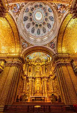 During the Spanish colonization of the Americas, from the 16th to the 18th centuries, thousands of churches were built in Mexico. The churches vary, but surviving examples from central Mexico are typically on a latin cross plan with a brick dome on a drum at the crossing. Adobe was widely used in early examples but these buildings were often replaced or destroyed by earthquakes.[127] Thick rib cross-vaulting in a dome-like shape was used in the 16th century. Most churches used a bell-gable instead of a bell tower, although stone bell towers were often added in later centuries, typically topped by a small hemispherical dome. Vaults and domes were usually built with brick and, like towers, were particularly vulnerable to earthquakes. Domes developed vertical cracks from the lateral movement and were more vulnerable than vaults because movement in the drums beneath them could increase the damage. A large amount of movement in a single event or the cumulative effect of multiple earthquakes could result in collapse. Only a few examples from the 16th century survive.[128] Domes were sometimes decorated with Azulejo tilework, a style inherited from the Islamic art of Al-Andalus.[129]