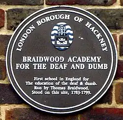 Other notable students included John Goodricke; an astronomer, Francis Mackenzie; a governor of Barbados, John Philip Wood; an author, genealogist, editor, and Over-Deputy of the Scottish Excise Office, and Jane Poole, who set a precedent for having her Last Will and Testament approved by a jury as valid and legally binding despite her execution of the will being dictated entirely by fingerspelling.[9] In 1784, Braidwood's nephew, Joseph Watson began studying as a teacher of deaf education under Braidwood. In 1792, John Townsend, along with Henry Cox Mason[10] Henry Thornton, and more, founded the Asylum for the Deaf and Dumb also known as the "London Asylum for the Education of Deaf and Dumb Children of the Poor" with Joseph Watson as the new institution's headmaster.[11] This school was hailed as the first public school for deaf education in Britain. Braidwood Academy for the Deaf and Dumb, now known as Braidwood School,[12] and the Asylum for the Deaf and Dumb which was later renamed the Royal School for Deaf Children[13] are still in operation to date. Braidwood School still employs the method of a "combined system" of education that was made popular by its founder.[14]
