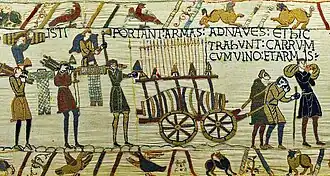 Some early governments, such as the Carolingians in eighth century, required soldiers to supply their own food for three months, but would feed soldiers thereafter for free if the campaign or siege was ongoing. Later, during the Saxon revolt of 1077–1088, Saxon soldiers were required to bring supplies enough for the entire campaign.[29] Some individual feats of logistics were formidable; after a seven-week campaign English archers shot up to half a million arrows during the battle of Crécy in 1346.[30][31]