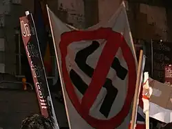 - ^ The march was organised by the Anti-Nazi League.[87] Thousands of people attended the demonstration, for which 2,600 police officers were deployed.[88] A hardcore element associated with the SWP and Militant[89] refused to accept police instruction to divert the march away from the BNP's headquarters itself, once it had gone past it. In a resulting riot, 21 police officers and 41 demonstrators were injured,[88] leading to a frontpage headline "Masked mob stone police" in the Mail on Sunday.[86]