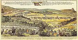 The conflict resumed in 1712 when the reformist inhabitants of Toggenburg revolted against the Prince-Abbot of Saint Gallen. The Second War of Villmergen initially took place mainly in eastern Switzerland but then moved westwards. In May, the Bernese occupied Mellingen, and Zurich occupied Bremgarten. In the "Battle of the Stauden", which took place near Fischbach-Göslikon on 26 May, the Bernese troops managed to extricate themselves from an ambush laid by the Central Swiss. Four days later, they besieged Baden in conjunction with the Zurich troops, attacked the fortress of Stein and succeeded in destroying it.[55] Finally, on 25 July, the decisive Second Battle of Villmergen took place. The conflict concluded with a decisive defeat for the Central Swiss forces at the hands of the Bernese.[56]