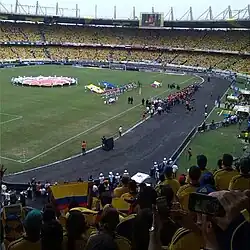 Despite the elimination, the national team was greeted by tens of thousands of Colombians in Bogotá, welcoming them back as heroes and restoring pride to the nation.[29] Colombia would then receive the FIFA Fair Play Trophy and have James Rodríguez and Juan Cuadrado end as the World Cup's leading goal scorer and assist leader, respectively.[30][31]