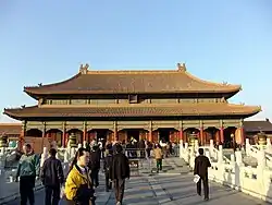 By October 1644, the Manchus had achieved supremacy in northern China, and prince regent Dorgon proclaimed the Qing dynasty as the successor to the Ming. A ceremony was held at the Forbidden City to proclaim the young Shunzhi Emperor as ruler of all China.[15] The Qing rulers largely maintained the Palace's Ming dynasty scheme, except for the names of some of the principal buildings. The Ming dynasty names favoured the character ji (simplified Chinese: 极; traditional Chinese: 極), meaning "supremacy" or "extremity", while the new Qing names favoured names meaning "peace" and "harmony"; for example, Huangji Dian, the "Hall of Imperial Supremacy", was changed to Taihe Dian, the "Hall of Supreme Harmony".[16]