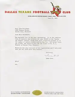 Hunt, with a roster replete with players who had played college football in Texas, wanted to maintain a lineage to the team's roots and wanted to name the club the Kansas City Texans.[2] "The Lakers stayed the Lakers when they moved from Minnesota to California", he reasoned. "But Jack Steadman convinced me that wasn't too smart. It wouldn't sell." The team was renamed the Kansas City Chiefs—one of the most popular suggestions Hunt received in a name-the-team contest.[6] Lamar Hunt sent letters dated June 21, 1963, to all the contest entrants who selected the name CHIEFS in the "Rename the Texans" contest of whom Mrs. Joan Feuerborn was one of those entrants, and along with their respective guesses as to the number of season tickets sold by May 1. The actual total was 10,808, and based on this the car winner was Mr. E. L. Diemler of Kansas City, Missouri, a warehouse manager who got the idea when making out a bill of lading to Chief Freight Lines.[7] Another name also considered at the time for the team was the Kansas City Mules.[6]