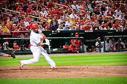 Shortly before the 2000 season, the Cardinals traded for Gold Glove center fielder Jim Edmonds from the California Angels.[27] With dazzling defense and a powerful bat that made him a favorite among Cardinal fans, "Jimmy Baseball" helped spark the Cardinals to playoff berths in six of the next seven years, won eight Gold Glove awards and hit 241 home runs in eight seasons in St. Louis.[28] Edmonds made an immediate impact and raised his production that season, hitting a career-high 42 home runs and winning his third Glove Glove.[29] The Cardinals took advantage of the high-scoring trend around baseball, plating 887 runs on their way to 95 wins and the Central division title.[30] McGwire was lost to a season-ending injury in 2000 with a .305 batting average, 32 home runs, 73 RBIs, a .483 on-base percentage and .746 slugging percentage in 89 games, but St. Louis brought in Will Clark from the Baltimore Orioles, and he stepped in with a .345 batting average, 12 home runs and a .655 slugging percentage.[31][32] Rick Ankiel, sporting a 94–97 MPH fastball and a "fall-off-the-table" curveball, finished second in both strikeouts per nine innings and the Rookie of the Year balloting.[33] However, an unexplained loss of control in that year's playoffs plagued him until he stopped pitching.[34] Powered by another heralded rookie in Albert Pujols, the Cardinals took the Wild Card the following year. Pujols enjoyed a career start unmatched in the entire history of the game. During his first eleven seasons, he batted .328 with 445 home runs, winning a batting title in 2003 at .359 and home run titles in 2009 and 2010. Third baseman Scott Rolen arrived via trade from the Phillies in 2002. With Edmonds and Pujols, the Cardinals featured three of the best hitters in baseball who were also highly regarded defensive players.