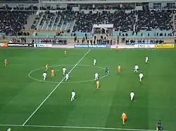 Nevertheless, the team defeated strong Nigeria 1–0 with the goal of Youssef Msakni from outside the penalty area, despite the absence of Mondher Kebaier from the match due to his infection with the COVID-19 virus, and he was replaced by his assistant Jalel Kadri.[207] In the end, the team was eliminated from the quarter–finals against Burkina Faso after a 0–1 defeat.[208] After this disappointing participation, Mondher Kebaier was dismissed from coaching the national team three years after his appointment and the appointment of his assistant Jalel Kadri. as his successor. Meanwhile, the draw for the third round of the African 2022 FIFA World Cup qualification was held, as it resulted in a home–and–forth match against Mali. In the first leg match at the Stade du 26 Mars in Bamako, Tunisia won out of the rules 1–0 thanks to Mali's Moussa Sissako's own goal after pressure from Youssef Msakni,[209] As for the return match at the Stade Hammadi Agrebi in front of 50,000 spectators, it ended in a 0–0 draw,[210] so that the Tunisian team qualified for the FIFA World Cup for the sixth time in its history.[211]