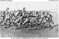 Before the invention of the football helmet, players would often grow their hair long, because they believed it would protect their heads.[4] The man largely credited with inventing the first helmet was George Barclay.[2] In 1896 he designed a headgear which soon became known as a "head harness". It had three thick leather straps forming a close fit around his head, made by a harness maker. Additionally, other sources credit the invention of the football helmet to U.S. Naval Academy Midshipman Joseph M. Reeves (later to become the "Father of Carrier Aviation"), who had a protective device for his head made out of mole skin to allow him to play in the 1893 Army-Navy Game after he was told by a Navy doctor that he must give up football or risk death from another kick in the head. Reeves went to a local shoemaker/blacksmith and had a crude leather helmet fabricated to protect his skull.[5] Before the first helmet, Edgar Allan Poe III (grandnephew of the famous writer) developed a small leather nose protector which, however, was found to severely interfere with vision and breathing and to come off easily[6]