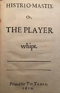 Histriomastix or The Player Whipped is a late Elizabethan play, written by the satirist John Marston and acted in 1599. It was previously thought that the play was likely acted by the Children of Paul's, one of the companies of boy actors active at the time; but more recent research suggests that Histriomastix was performed at the 1598–9 Christmas revels of the Middle Temple.[1] (Plays acted at the Inns of Court could take an approach opposite to that of the professionals, maximizing rather than minimizing the number of roles to make room for enthusiastic amateurs. Without doubling, a production of Histriomastix could accommodate as many as 120 performers. The play's rich texture of legal humor also suggests an Inns of Court performance.)[2]