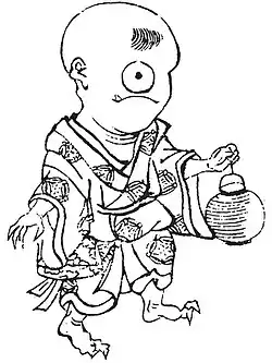 Hitotsume-kozō (一つ目小僧) are a Yōkai (supernatural apparition) of Japan that take on the appearance of a bald-headed child with one eye in the center of its forehead similar to a cyclops.