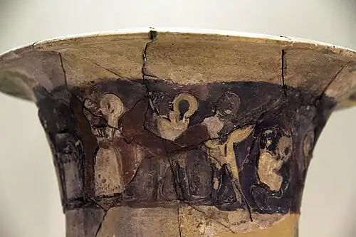 The little archaeological evidence that there is consists largely of depictions on ritual vessels and on stone reliefs. Musical instruments or their components are rarely recovered, in comparison with the situation in Mesopotamia and Egypt. Some relatively well-preserved noise-makers, such as rattles, clash cymbals[2] and sistrums have been recovered from pre-Hittite times. Cult vases from the early Hittite period, such as the İnandık vase, the Bitik vase, and the Hüseyindede vases have depictions of people playing music, often accompanied by acrobats and sacrifices.