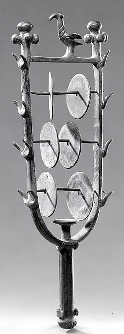 Sistrums are archaeologically attested from the early Bronze Age (3rd millennium BC). They consist of a U or V-shaped frame with three crossbars, which each hold two metal plates. There are two well-preserved sistrums from Horoztepe, which are decorated with birds, cattle, deer, and other animals.[24]