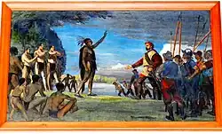 Painting by Adrien Hébert representing Jacques Cartier meeting the Iroquois. The Iroquois chief raises his arm as a sign of welcome, while Cartier responds by raising his own slightly while keeping the other hand on his sword.