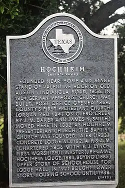 In 1848, Valentine Hoch, a German immigrant from the disputed Alsace-Lorraine region, traveled to the rolling hills near the lower Guadalupe River with his son, after arriving in America at the port of Indianola, Texas. Upon arrival to the hills, Hoch remarked: "Here we shall build our home." Construction of the home soon began from the stones at the Guadalupe River bed, and was completed several years thereafter. Others with surnames that included Crawford, Helms, Humphrey, Steen, Morrisse, Times, and Schwab, began to build homes and establish businesses in the area; soon the community of Hochheim was established.[3] The name could be translated to mean "Hoch's home" for the earliest settler, or "High home" for the fact that Hoch constructed his home on a hill. Townspeople also referred to the settlement as "Dutchtown".[4]