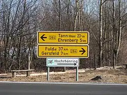 The route is signposted with signs that display the black lettering Hochrhönring on a white background, usually with a thistle on a dark green background (which is often rather faded).