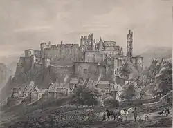 Schloss Dhaun is a castle ruin in the Hunsrück within Hochstetten-Dhaun’s municipal limits. The castle and the like-named constituent community lie high above the Kellenbach valley. It is said to be the biggest complex of its kind in the Nahe valley. Built in the 12th century as a defensive fortification (a Burg or "castle" rather than a Schloss or "stately home") by the Counts of the Nahegau, it had its first documentary mention in 1215 as castrum de Dune (“the castle on the heights”) and was then a fief of Saint Maximin's Abbey in Trier. In the Middle Ages, the complex protected the territory held by the Waldgraves, who were the Nahegau counts’ successors. In 1340, during the so-called “Dhaun Feud” (Dhauner Fehde), the castle was besieged by Prince-Archbishop-Elector of Trier Baldwin's troops. Baldwin was at odds with the lord of the castle, Johann I of Dhaun, over the Schmidtburg. The Prince-Archbishop-Elector prevailed in the siege, and Johann eventually had to grant him the unhindered use of the castle in times of war or feud (an arrangement called Öffnungsrecht in German history). In connection with the Dhaun Feud, a whole ring of castles sprang up, among them Castle Brunkenstein (actually the addition of an outer bailey), Castle Rotenberg, Castle Martinstein, the siege position of Geiersley and the castle on the Johannisberg (mountain). Johann I died in 1350 without a male heir, and therefore the complex passed to his nephew, Rhinegrave Johann II of Stein, Johann's sister Hedwig's son. With him began the long era of the Waldgraves and Rhinegraves of Dhaun. In the 15th and 16th centuries, the castle was further expanded and fortified. It is from that time that the barbican at the upper bailey comes. This was built in 1526. The three-level network of underground passageways and rooms was also built in these centuries. The passageways emerge from the ground at an exit at the foot of the castle, into its neck ditch. Finished in 1729 was the remodelling of the castle, such as it had become by then, into a residential castle – a Schloss – under Waldgrave and Rhinegrave Karl von Dhaun and his wife Luise, born Countess of Nassau-Saarbrücken. The palas in the west was converted into a palatial dwelling, and onto its south side was built a wing several floors tall. Together with a somewhat older building to the north, the whole complex thereby took on a horseshoe-shaped footprint. The land around the upper bailey became the Schloss garden with a carriage house. Count Karl did not, however, get much time to enjoy his converted castle home, for only four years after work was finished, he died in 1733. One year later, the Schloss was threatened with destruction during the War of the Polish Succession, a fate then already suffered by the neighbouring Castle Kyrburg. Count Karl's widow, though, somehow managed to keep this from happening. In 1794, French Revolutionary troops conquered the Nahe region and thereby also Schloss Dhaun. It was taken into state ownership and its remnants were auctioned in 1804 with a view to carting the stone off for other purposes. The buyer, who paid 1,200 francs for it, was Andreas van Recum, a high official in the French administration, the sous-préfet in the Arrondissement of Simmern. He had all usable parts of the building complex taken to the Kauzenburg (another castle) in Bad Kreuznach. An end was put to the ruin's inexorable crumbling only in the 19th century when in 1850 a physician from Trier acquired part of the complex and began with work to reinstate some of the castle's former glory, but with a somewhat Romanticized vision of what a castle should look like, which had rather little to do with the former mediaeval reality. It is from this time that the building elements at the castle's entrance gate date. Further changes in ownership followed until at the turn of the 20th century, a manufacturer from Kirn named Simon acquired Schloss Dhaun and undertook various new building projects and renovations on the upper bailey. It was he who had the new great hall on the ruin of the north wing, using parts of the building that still stood. The old entrance and the 16th-century builder's family coat of arms can still be made out. The Simons also acquired the Prometheus figure, created by the sculptor from Kreuznach, Robert Cauer the Elder, in Rome in 1888. In 1954, the Schloss was transferred to the Zweckverband Schloss Dhaun (a Zweckverband is an intercommunal association with the goal of undertaking an important public work) comprising the town of Kirn, the then Amt of Kirn-Land and the Bad Kreuznach district. It still owns the Schloss today. Preserved at this mediaeval castle complex now in the area of the upper bailey are ruins of Saint George’s Chapel (St.-Georgskapelle), consecrated in 1661 and the kitchen building as well as two bastions and the girding wall with defensive towers and a gatehouse. In the west wing, the former palas, the entrance portal is preserved. The building was reconstructed by the Zweckverband, and since 1957 it has housed the Heim-Volkshochschule Schloss Dhaun, a training centre for youths and adults whose scholastic head for many years was the historian Werner Vogt. Also housed at the Schloss since 1991 has been the Kommunalakademie Rheinland-Pfalz, also an educational institution. At the lower bailey, the Bad Kreuznach district maintains at the site of the watchtower a youth training centre, and the great hall is available for celebrations.