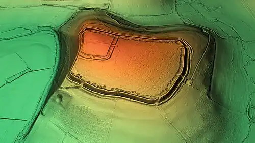 The fort is roughly rectangular (600 by 400 m (2,000 by 1,300 ft)), with an enclosed area of 22 ha (54 acres).[2] There is a steep natural slope down to the River Stour to the west, the other sides have an artificial rampart, ditch and counterscarp (outer bank), with an additional rampart on the north side. The main entrance is at the south-east corner, with other openings at the south-west and north-east corners.