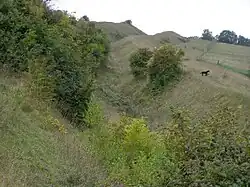 A view of the northern side of Hod Hill with the inner rampart on the left, the ditch in the middle and the outer rampart on the right.