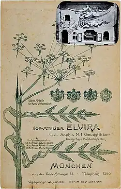 The new studio building that housed the Munich atelier at Von-der-Tann-Strasse 15, built in 1898, became a prominent structure in the style of Art Nouveau, and the façade was a design by the architect August Endell in the years from 1896 to 1898. Endell's work was influenced by Victor Horta. His plans, were licensed in April 1898 with the remark, that they were a "mockery of drawing art".[1] The façade, with its red and golden dragon-like stucco ornament on a green ground,[2] was especially criticized. The design was called "Octopus Rococo", and the building was variously called the "dragon's castle" or the "Chinese embassy".[3] The Atelier Elvira building was an artist's meeting point from the beginning. Soon after the building was completed, the founders' paths went separate ways. In 1907, Augspurg sold her share to Goudstikker, who later leased it to the young photographer Emma Uibleisen. After World War I most of the traditional clients disappeared. When Uibleisen died in 1928 there was no successor.