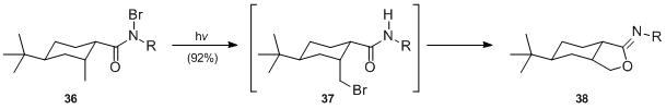 • It has been demonstrated that photolysis of N-haloamides proceeds efficiently under neutral conditions. Irradiation of N-bromoamide 36 (R=tBu) gave rise to bromomethyl-cyclohexane-amide 37 which, upon treatment with base in situ afforded iminolactone 38 in 92% yield.[22]