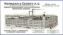 Hofmann & Czerny AG [not to be confused with other piano makers such as Ferdinand Hofmann (ca. 1756–1829), August Hoffmann, George Hoffmann, W. Hoffmann, Karl Hofmann, Hofmann & Scholz or Hofmann & Schulze] was founded in 1903 by Julius Carl Hofmann (b. 1873, Bohemia. d. 1948, Vienna[1]) in Penzing (Vienna) and was known as Europe's largest piano manufacturer at the time.[2] It was awarded the Austrian coat of arms on June 11, 1931, as it used to be the imperial court's personal piano supplier.[2] The company produced and sold world famous pianos under the name "Hofmann" and later as "Hofmann & Czerny". The company began producing pianos in its factory under license in 1924. The pianos were also produced in Czechoslovakia under "Jihlavská továrna, a.s." generated under license.