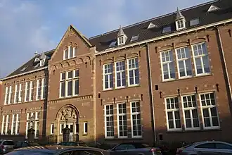 This school was founded as a city HBS in 1864 next to the Stedelijk Gymnasium Haarlem.[3] The HBS-b was a five-year educational system, and until 1875 it was actually merged with the Stedelijk. In the first grade there were 76 HBS students and 19 gymnasium students, all boys. In 1887 the school opened for girls, and four joined that year.[3] The girls were not allowed to follow gym class with the boys, but could complete the five-year course. When it was merged with the Stedelijk, the school was popular with boys from the Dutch colony in Indonesia desiring a high quality classical education, and several noble families from Indonesia sent their sons there. The Stedelijk separated in 1875, but merged again from 1925 to 1933 as a lyceum. The second merger was a success, and the school grew from 285 students in 1925 to 503 students in 1933. In 1933 the Stedelijk separated again.
